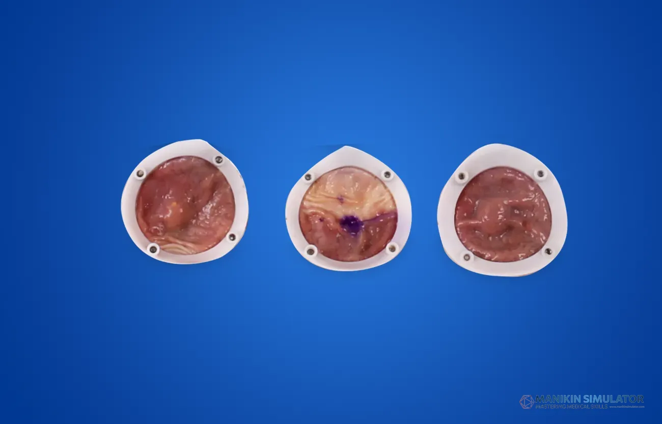 Model pelatihan ESD (Endoscopic Submucosal Dissection) menggunakan jaringan lambung babi yang diproses atau silikon khusus. Mensimulasikan lapisan mukosa dan submukosa untuk latihan diseksi tumor dini.