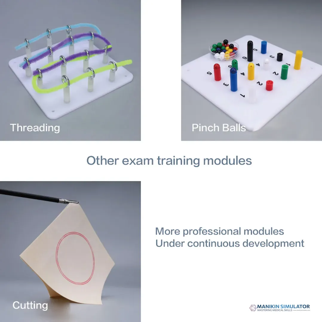 Dilengkapi dengan instrumen laparoskopi latihan (grasper, dissector, scissors, needle holder) dan berbagai modul latihan keterampilan (jahit, potong, koordinasi tangan-mata). Desain ergonomis meniru posisi operasi klinis.