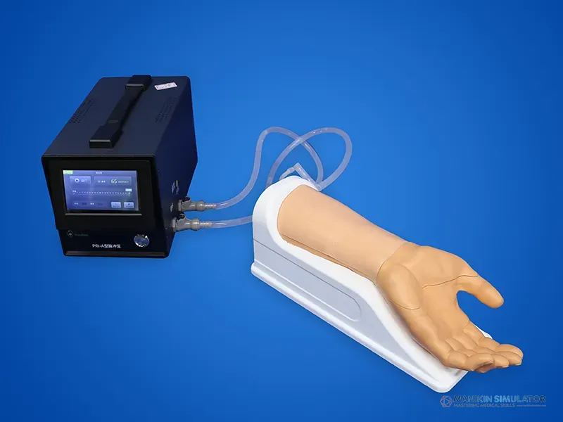A: Bisa dihubungkan dengan pompa pulsasi (opsional) untuk mensimulasikan denyut nadi arteri radialis.