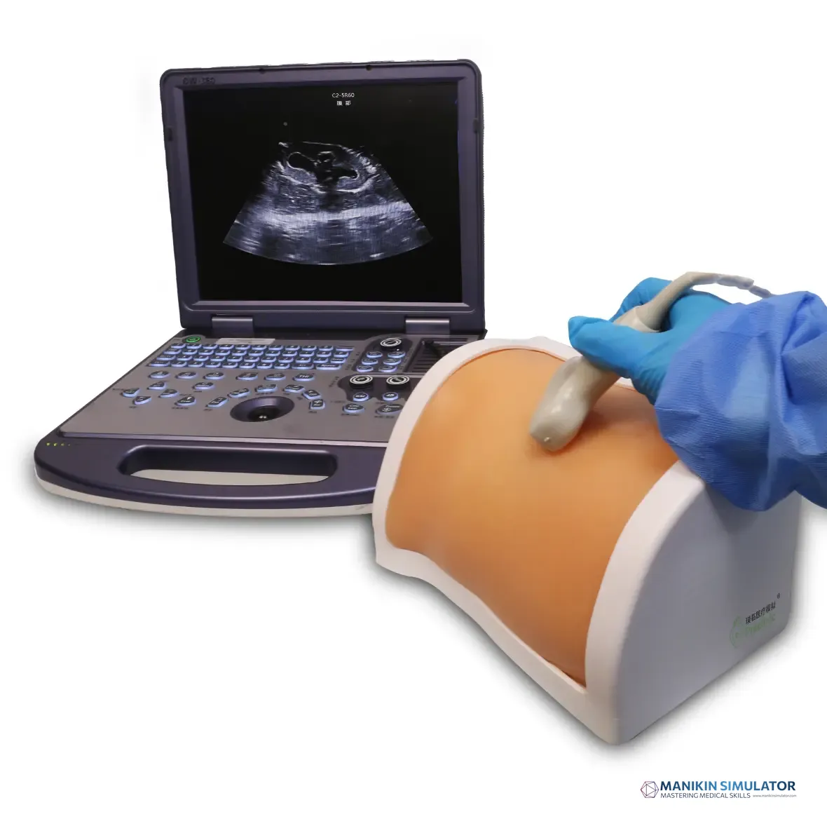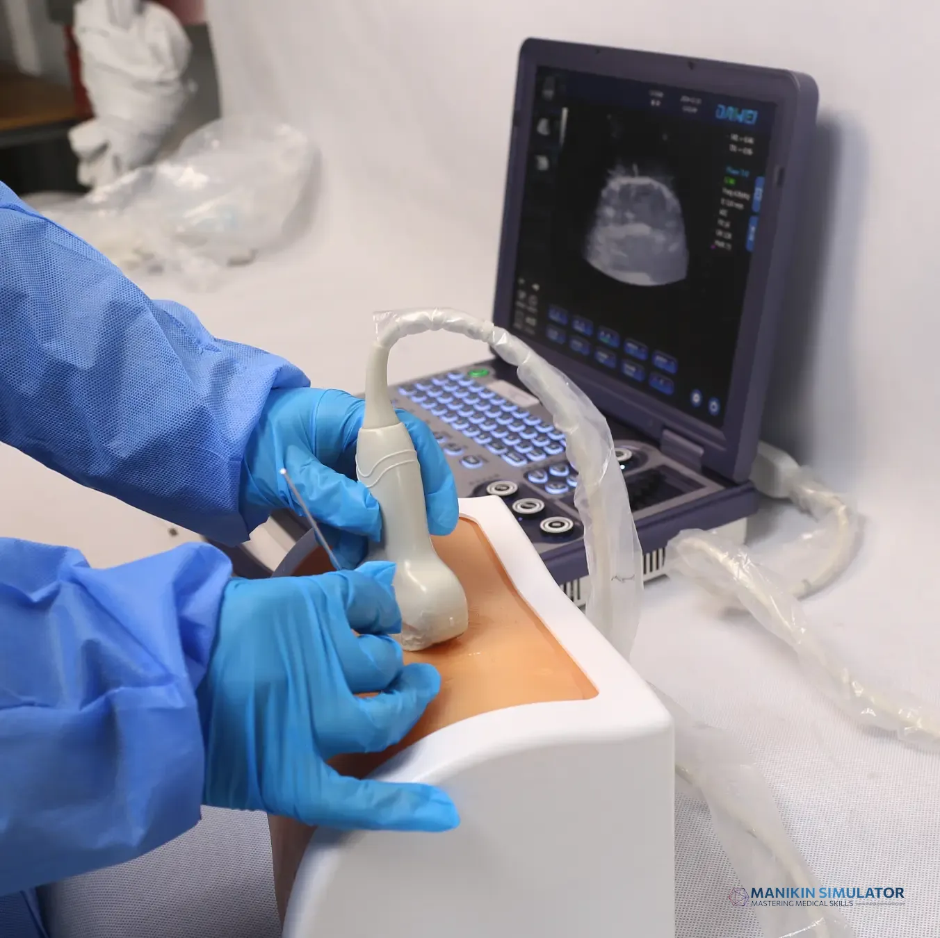 Material khusus *ultrasound-compatible* memungkinkan visualisasi ginjal dan batu ginjal secara jelas di layar USG untuk panduan tusukan jarum ke kaliks yang tepat.